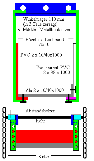 Nach längeren Irrungen erscheint mir der nebenstehende Aufbau am einfachsten und am wenigstens aufwendig zu sein. Er impliziert jedoch, daß beim Befahren der Gondel keine vertikale Justierung erfolgt sondern nur sichergestellt wird, daß die Schienen horziontal fluchten. Denkbar wäre aber auch eine individuelle Justierung jeder Gondel, etwa durch eine von unten nach oben greifende "Lehre"; dies würde jedoch erfordern, daß die Gondeln mittels Kettchen aufgehängt werden. So sicher diese Lösung auch in Hinblick auf das gefahrlose Befahren der Gondel ist, so aufwendig und mit Heimwerkermethoden unlösbar scheint mir dieses Konstrukt zu sein. Aber ich lasse mich gerne eines besseren belehren.