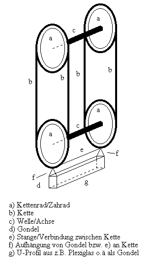 Ähnlich schwierig scheint die Aufhängung der Gondeln an der Kette zu sein. Der glückliche Besitzer eines umfassenden Maschinenparks fertigt sich die Teile leicht mit der erforderlichen Präsizion selbst; der typische Bastler schaut aber in die Röhre. Es sind also Improvisationen mit gängigen Industrieprodukten gefragt, wobei die Problematik m.E. auch ist, daß der Bastler nicht weiß, was es alles gibt und er zweckentfremden bzw. verwenden kann.