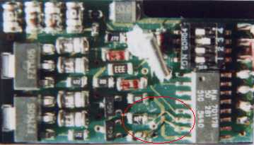Bei diesen neuen Dekoder müssen Sie auch die Verbindungen von Pin 6 und 7 zu Pin 8 mit einem scharfen Messer oder Skalpell beseitigen. Diese sollen offenbar die hier beschriebene Erweiterung erschweren. Oder aber Sie löten die Pins 6 und 7 ab und biegen sie vorsichtig etwas nach oben; es empfiehlt sich dann, etwas Isolierband zwischen Pins und Platine zu kleben.